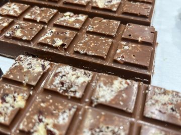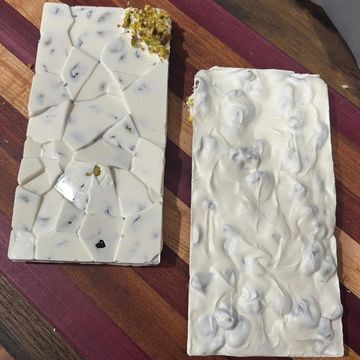 White Chocolate bar swirled together with Dried Cranberries and Pistachios