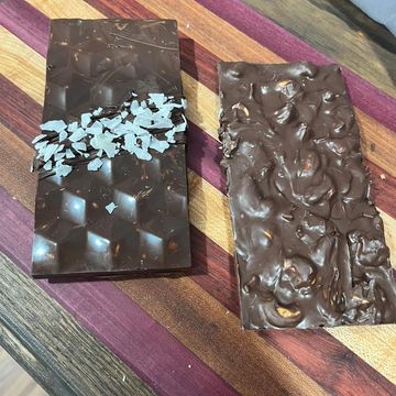 Salted Pistachios, Slivered Almonds, Pumpkin Seeds, Sunflower Seeds and Shaved Coconut backed in Milk or Dark Chocolate Drizzled with White Chocolate