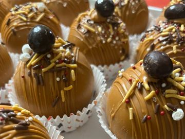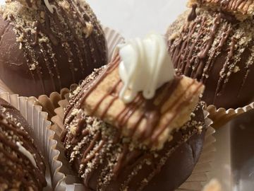 Cocoa Powder, Instant Coffee and Mini Marshmallows inside a Dark Chocolate Shell topped with chocolate covered coffee beans