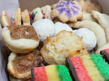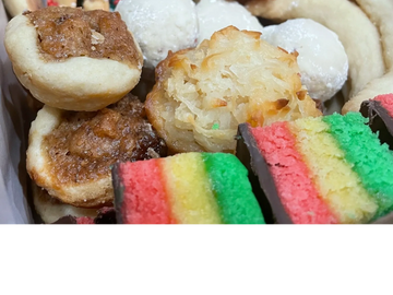 6" x 9" bakery box containing an assortment of: Butter Spritz, Russian Tea Cakes, Coconut Crescents, Walnut Tassie, Rainbow, Coconut Macaroons, and Chocolate Lace