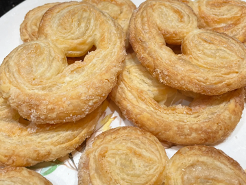Puff pastry dough folded with sugar and baked until crispy and sugar caramelizes on the bottom