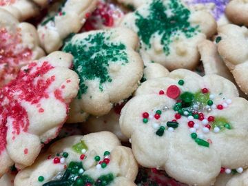 Butter Spritz - Buttery sweet shaped with a cookie press decorated with sprinkles