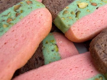 Crisp thin cookie slice with a layer of chocolate, pistachio and rum flavor