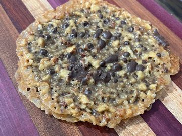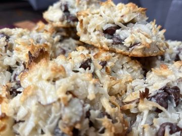 Sweetened coconut, semi-sweet chocolate chips and sliced almonds baked until crisp little edges form on the outside