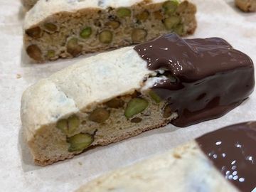 Generous amounts of Pistachio inside a crisp Biscotti half dipped in Dark Chocolate